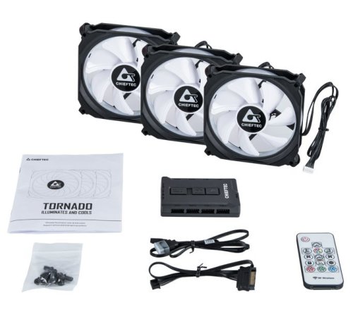 Součástí balení je RGB ovladač (1x 5 V adresovatelný M/B konektor, 6x 6-pin ventilátorové konektory, 2x + 5 V LED páskové konektory), 1x 5 V adresovatelný RGB M/B kabel, dálkové ovládání, 1x SATA napájecí kabel a 12x montážní šrouby.