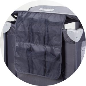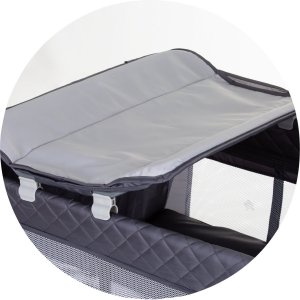 2v1 - slouží jako postýlka a jako pohodlná ohrádka, vhodná pro novorozence a děti do 15 kg, vyrobena z vysoce kvalitní tkaniny, 2 polohy nastavení výšky matrace, boční vchod se zipem, dvě kolečka s brzdami pro snadnější přemisťování postýlky, přebalovací pultík, organizér pro příslušenství je součástí přebalovacího pultu, velká postranní kapsa na hračky a jiné nezbytnosti, boční kapsa na zip, závěsný oblouk se třemi plyšovými hračkami, snadné skládání a rozkládání, balení obsahuje: skládací cestovní postýlku, druhou vrstvu s měkkou podložkou, přebalovací podložku, přihrádku na doplňky, závěsný oblouk se třemi plyšovými hračkami, tašku na přenášení a skladování.