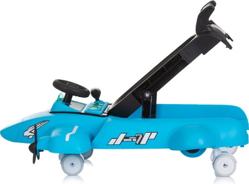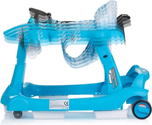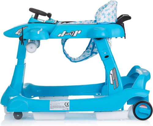 vhodné pro děti od 6 měsíců s hmotností do 12 kg, horní část lze oddělit a přeměnit na tlačící hračku – letadlo, zábavný hrací panel s hračkami a hudbou, vyrobeno z kvalitního a bezpečného plastu, široká základna pro lepší stabilitu, 3 úrovně výšky sedátka pro přizpůsobení růstu dítěte, inovativní regulace rychlosti a blokace zadních kol, dvojitá gumová zadní kola, 5 bezpečnostních zarážek proti převrácení a pádu ze schodů, 4 kolečka (přední otočná o 360°), snadné skládání a kompaktní skladování, jednoduchá montáž, napájení: 2× AA,1,5V baterie (nejsou součástí balení), vyrobeno v souladu s evropskou normou EN 1273.