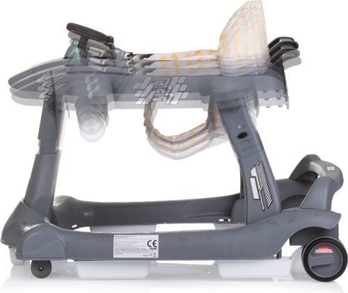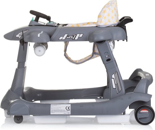 vhodné pro děti od 6 měsíců s hmotností do 12 kg, horní část lze oddělit a přeměnit na tlačící hračku – letadlo, zábavný hrací panel s hračkami a hudbou, vyrobeno z kvalitního a bezpečného plastu, široká základna pro lepší stabilitu, 3 úrovně výšky sedátka pro přizpůsobení růstu dítěte, inovativní regulace rychlosti a blokace zadních kol, dvojitá gumová zadní kola, 5 bezpečnostních zarážek proti převrácení a pádu ze schodů, 4 kolečka (přední otočná o 360°), snadné skládání a kompaktní skladování, jednoduchá montáž, napájení: 2× AA,1,5V baterie (nejsou součástí balení), vyrobeno v souladu s evropskou normou EN 1273.