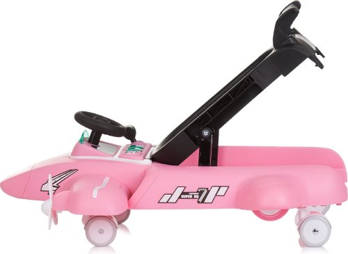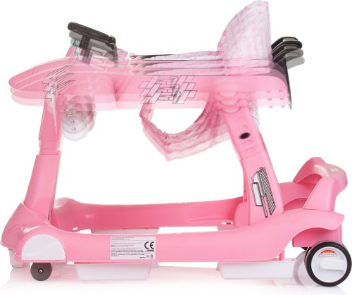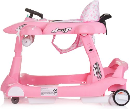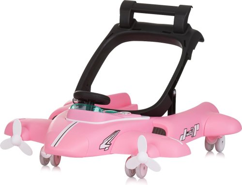 vhodné pro děti od 6 měsíců s hmotností do 12 kg, horní část lze oddělit a přeměnit na tlačící hračku – letadlo, zábavný hrací panel s hračkami a hudbou, vyrobeno z kvalitního a bezpečného plastu, široká základna pro lepší stabilitu, 3 úrovně výšky sedátka pro přizpůsobení růstu dítěte, inovativní regulace rychlosti a blokace zadních kol, dvojitá gumová zadní kola, 5 bezpečnostních zarážek proti převrácení a pádu ze schodů, 4 kolečka (přední otočná o 360°), snadné skládání a kompaktní skladování, jednoduchá montáž, napájení: 2× AA,1,5V baterie (nejsou součástí balení), vyrobeno v souladu s evropskou normou EN 1273.