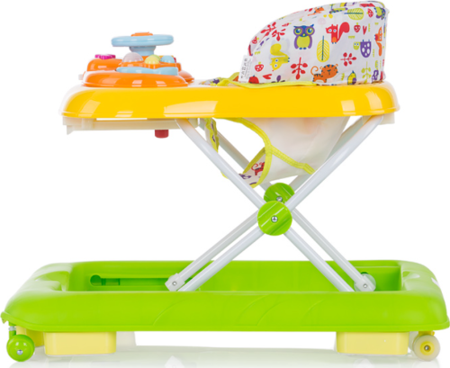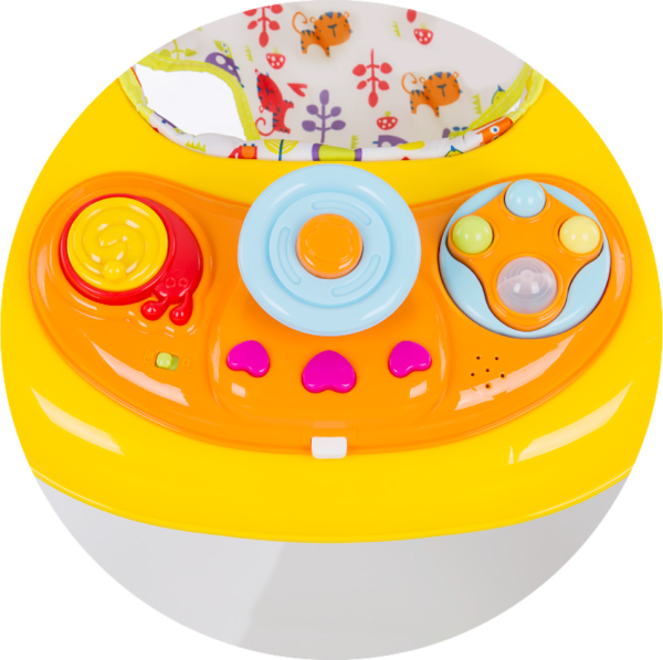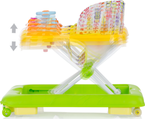 široká základna pro lepší stabilitu 3 výškové polohy sedátka, které odpovídají výšce dítěte 6 zarážek zabraňujících převrácení nebo pádu ze schodů 4ks koleček - přední kolečka se otáčejí o 360 stupňů pultík s interaktivním panelem snadno se skládá a skladuje snadná montáž