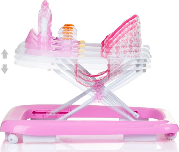 široká základna pro lepší stabilitu 3 výškové polohy sedátka, které odpovídají výšce dítěte 6 zarážek zabraňujících převrácení nebo pádu ze schodů 4 kolečka - přední kolečka se otáčejí o 360° pultík s interaktivním panelem a hrazdičkou snadno se skládá a skladuje snadná montáž
