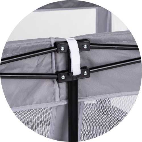 boční dvířka se zipem umožňují dítěti samostatně vstoupit i vystoupit, prodyšné síťované panely zajišťují optimální cirkulaci vzduchu a přehled o dítěti za všech okolností, odolný kovový rám a protiskluzové nožky poskytují maximální stabilitu, lehká, snadno sestavitelná a jednoduchá na údržbu, součástí balení jsou 2 ks držacích kroužků, které dítěti pomáhají přitáhnout se a postavit se.