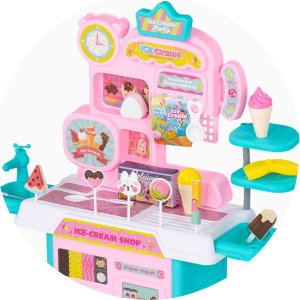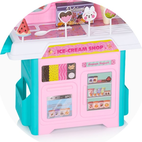 díky realistickému designu umožňuje sada dětem „připravovat“ a servírovat různé druhy zmrzlin, vymýšlet si vlastní kombinace chutí a hrát si na obchod, rolové scénáře „prodavač–zákazník“ rozvíjejí představivost a sociální dovednosti při hře s přáteli a rodiči, různé zmrzliny, kornouty, naběračky a doplňky, které podporují kreativitu při vytváření různých „příchutí“, pomáhá rozvíjet jemnou motoriku a koordinaci oko–ruka prostřednictvím skládání, servírování a kombinování jednotlivých prvků, učí děti základním dovednostem týmové práce a komunikace, když si hrají společně, rozměry hračky: 50 x 38 x 20 cm.