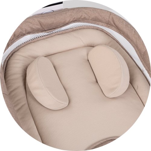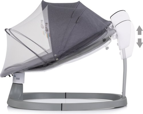 3 různé typy houpání s různými úrovněmi rychlosti, časovač na 15, 30 a 45 minut, různé melodie, poloha vleže a vsedě – vhodné pro spánek, krmení i hraní s dítětem, nastavitelné opěradlo do 2 poloh, rám s LED dotykovým displejem, stříška s měkkými plyšovými hračkami, měkká opěrka hlavy, bezpečnostní pás, moskytiéra, dálkové ovládání, napájení kolébky pomocí AC,DC adaptéru – AC: 100–240 V, 2.0 A (je součástí balení), rozměry výrobku: 80 x 55 x 70 cm.