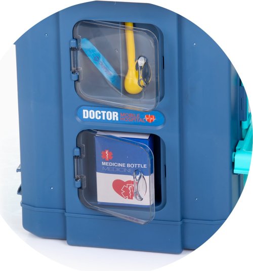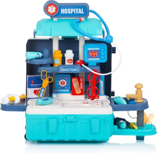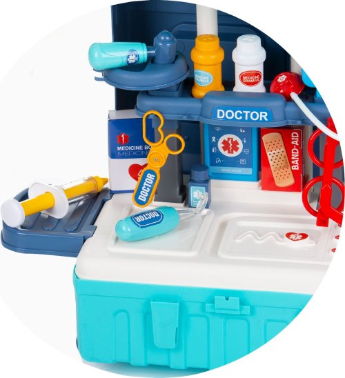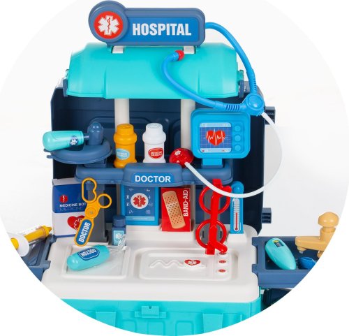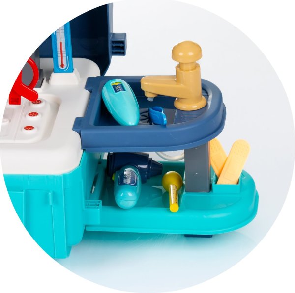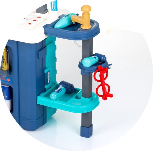 Sadu 3v1 jednoduše proměníš z kufříku v mobilní nemocnici nebo lékařský stůl. Rozvíjí představivost a kreativitu. Pomáhá dětem zbavit se strachu z návštěvy lékaře prostřednictvím hry a zkoumání. Kohoutek na vodu s pumpičkou. Rozměry výrobku (ve složeném stavu): 72cm х 26cm х 59,5cm. Provoz nástrojů na baterie 2x AG10 (součást balení). Vhodné pro děti od 3 let.