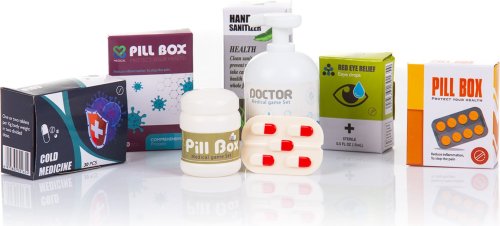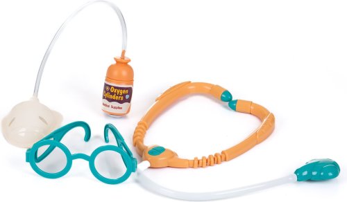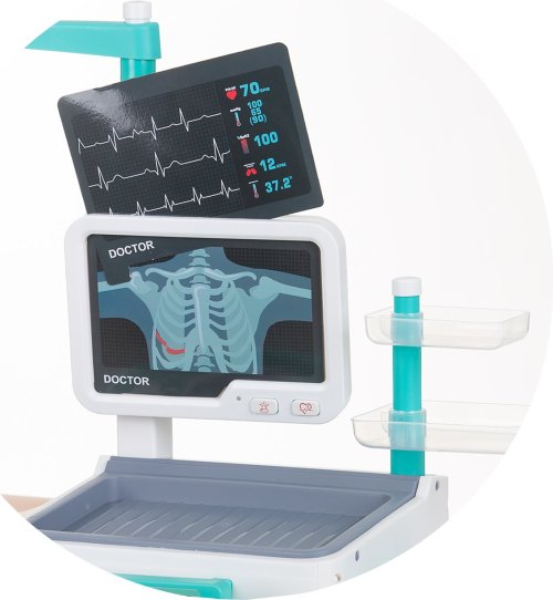 obsahuje 26ks příslušenství - vozík na příslušenství s policemi, rentgenový panel s osvětlením, vyměnitelné šablony se snímky plic, páteře, ruky a také EKG, stetoskop, kapačka, kyslíková maska s lahví a další doplňky, interaktivní hračka se zvuky a světly, pro provoz jsou třeba baterie: 2ks AAA,1,5 V (nejsou součástí balení), rozměry vozíku (ve složeném stavu): 115 x 46,5 x 26,5 cm.