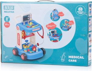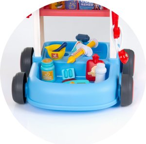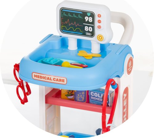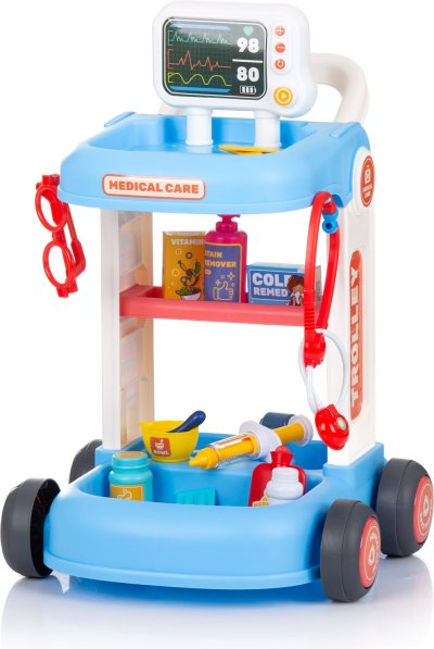 Vozík na kolečkách s madlem a příslušenstvím. Rozvíjí představivost a kreativitu. Pomáhá dětem zbavit se strachu z návštěvy lékaře prostřednictvím hry a zkoumání. Rozměry výrobku (ve složeném stavu): 34 х 38 х 37 cm.