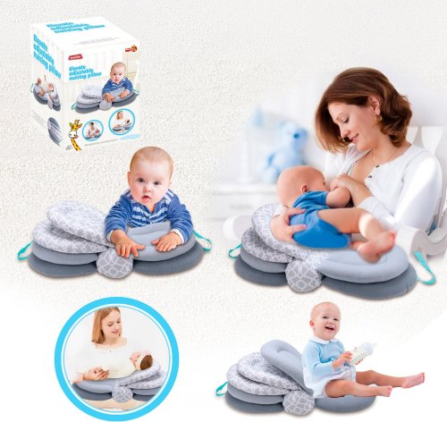 konstrukce s nastavitelnou výškou, vhodný pro kojení, krmení z lahvičky i jako podpora při sezení dítěte, měkký a pohodlný povrch, snadné použití, údržba i skladování, zajišťuje správnou polohu při kojení – snižuje zátěž zad a paží, poskytuje pohodlí a stabilitu při krmení z lahvičky, ideální pro každodenní použití již od prvního dne, neutrální stylový design ladící s každým interiérem, rozměry polštáře: 67 × 25 × 15 cm.