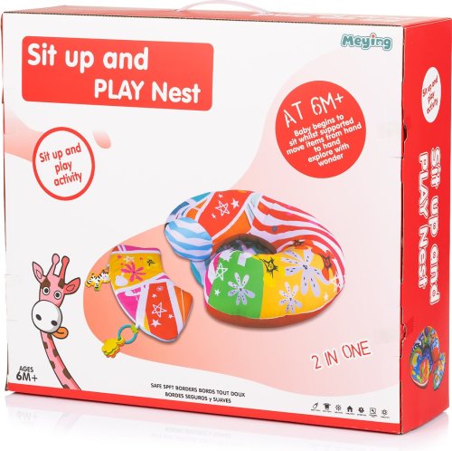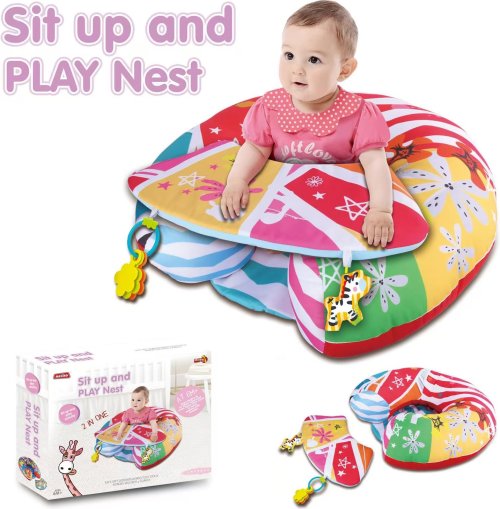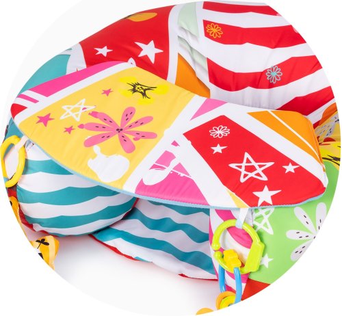 podporuje dítě při sezení, vytváří měkké a bezpečné „hnízdo“ pro hraní, podporuje rozvoj motoriky a soustředění díky jasným barvám a hračkám, snadno se čistí a je ideální pro každodenní použití, perfektní pro nejmenší, kteří začínají objevovat svět her a pohybu, velikost polštáře: 50 × 50 × 15 cm.