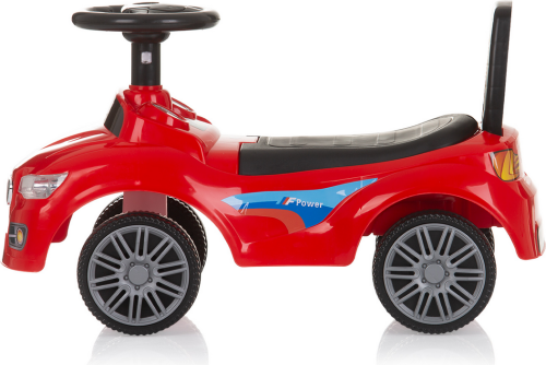 stimuluje rozvoj motorických dovedností a koordinaci pohybu dítěte, když dítě sedí v odrážedle, může být autíčko poháněno nohama dítěte, volant se volně otáčí a dítě může provádět lehké manévry, prostorné sedadlo, úložný prostor pod sedadlem, pohodlná opěrka zad, zábavné melodie na volantu - pro provoz jsou třeba 2 ks 1,5V baterie AA (nejsou součástí balení).