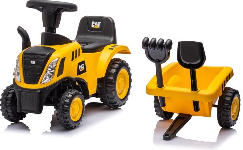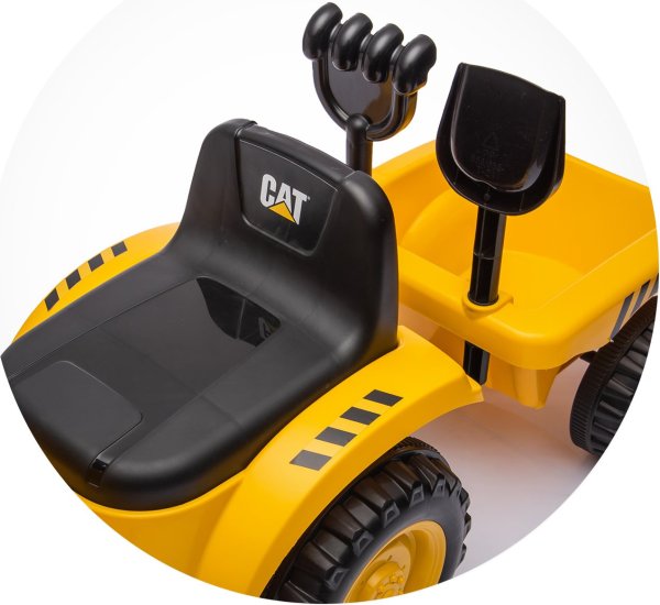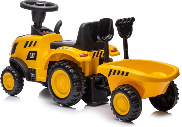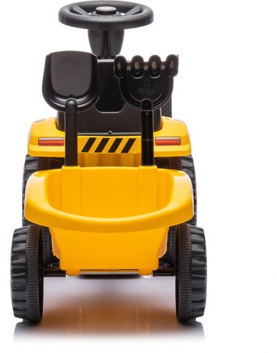 volant se zvukem klaksonu lze volně otáčet, přívěs pro přepravu dalších hraček, součástí balení je lopatka a hrábě, pohodlné a prostorné sedadlo, úložný prostor na potřebné věci pod sedadlem, pro provoz jsou třeba baterie 2x АA,1,5V (LR6) (nejsou součástí balení).