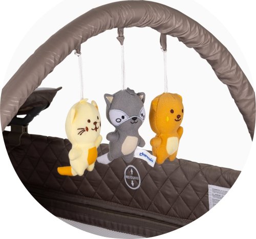 2v1 - slouží jako postýlka a jako pohodlná ohrádka, vhodná pro novorozence a děti do 15 kg, vyrobena z vysoce kvalitní tkaniny, 2 polohy nastavení výšky matrace, boční vchod se zipem, dvě kolečka s brzdami pro snadnější přemisťování postýlky, přebalovací pultík, organizér pro příslušenství je součástí přebalovacího pultu, velká postranní kapsa na hračky a jiné nezbytnosti, boční kapsa na zip, závěsný oblouk se třemi plyšovými hračkami, snadné skládání a rozkládání, balení obsahuje: skládací cestovní postýlku, druhou vrstvu s měkkou podložkou, přebalovací podložku, přihrádku na doplňky, závěsný oblouk se třemi plyšovými hračkami, tašku na přenášení a skladování.
