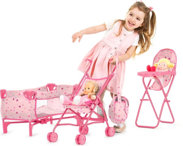 super lehká sada, zlepšuje fyzickou koordinaci dítěte, rozvíjí v dětech péči o druhé, starostlivost a ohleduplnost, všechny tři hračky se snadno a rychle složí do kompaktní velikosti pro přenášení a skladování, rozměry kočárku: 51 x 27 x 55 cm, rozměry postýlky: 56 x 32 x 33 cm, rozměry jídelní židličky: 33 x 29 x 57 cm.