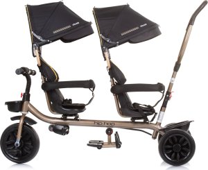 multifunkční výrobek se 2 různými způsoby použití - rodič děti tlačí nebo dítě vpředu tříkolku pohání pomocí pedálů dvě polohy předního sedadla - režim po směru jízdy a režim, kdy děti sedí čelem k sobě obě sedadla se otáčí o 360 stupňů obě sedadla jsou vybavena bezpečnostními madly pohodlná rukojeť pro rodiče dvě skládací a pohyblivé opěrky nohou blatníky na předním kole dvě velké skládací stříšky se slunečními clonami dvě široká a pohodlná sedadla s měkkým textilním potahem a bezpečnostními pásy úložné koše vpředu a vzadu brzdové pedály na zadních kolech kryt kola na předním kole, který zabraňuje zachycení dětských nohou