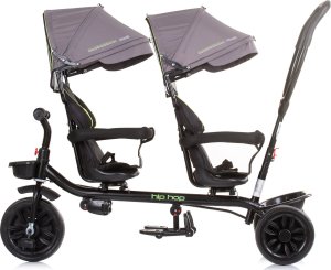 multifunkční výrobek se 2 různými způsoby použití - rodič děti tlačí nebo dítě vpředu tříkolku pohání pomocí pedálů dvě polohy předního sedadla - režim po směru jízdy a režim, kdy děti sedí čelem k sobě obě sedadla se otáčí o 360 stupňů obě sedadla jsou vybavena bezpečnostními madly pohodlná rukojeť pro rodiče dvě skládací a pohyblivé opěrky nohou blatníky na předním kole dvě velké skládací stříšky se slunečními clonami dvě široká a pohodlná sedadla s měkkým textilním potahem a bezpečnostními pásy úložné koše vpředu a vzadu brzdové pedály na zadních kolech kryt kola na předním kole, který zabraňuje zachycení dětských nohou