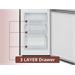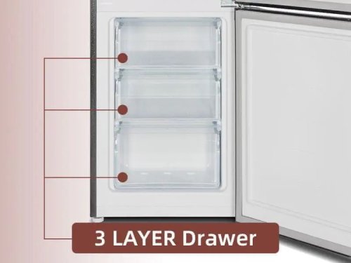 V lednici najdete tři nastavitelné police z tvrzeného skla a tři přihrádky ve dveřích, v mrazáku jsou tři šuplíky.