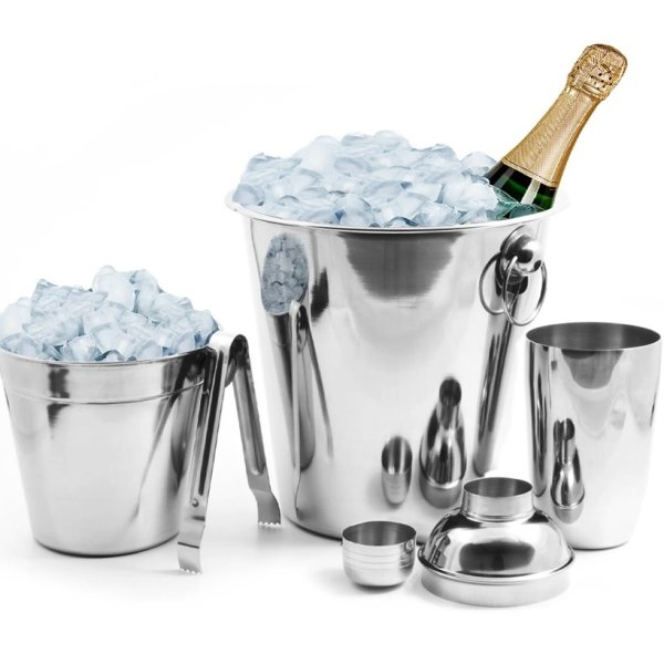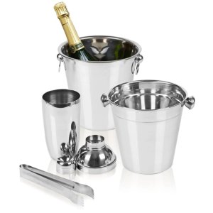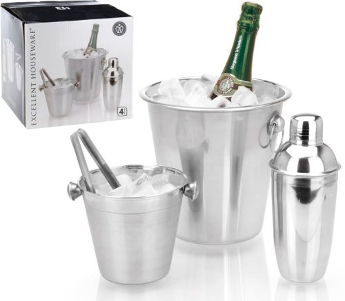 • bohatě vybavený barmanský party set 4 ks- materiál: nerezová ocel- lesklý vnější povrch- matný nerezový vnitřní povrch- sada 4 ks obsahuje:- kbelík na led 14 x 14 cm- chladič na víno/šampaňské 20 x 21 cm- barmanský shaker 500 ml- kleště na led 12 cm- barva: stříbrná