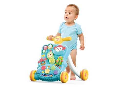 Chodítko interaktivní. Návod na složení na obalu. Baterie 2x AAA (1.5V) nejsou součástí balení. Nastavitelná výška madla, nastavení odporu koleček pro regulaci rychlosti chůze. Vydává zvukové efekty. 2 varianty - modrá, červená.