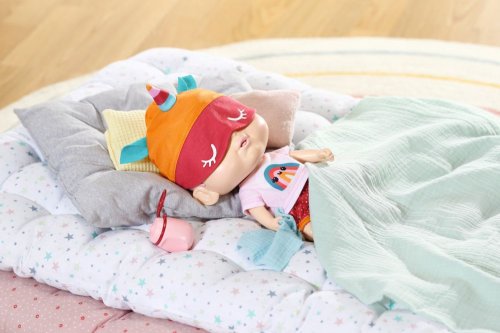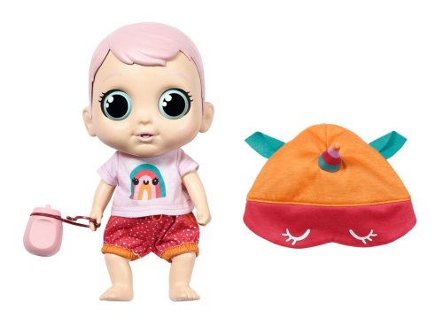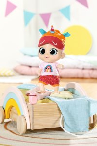 CHOU CHOU prostě neposedí. Nadšeně hýbe očima a netrpělivě čeká na další kolo hry Takhle jedou páni. A už s maminkou zase vesele poskakuje. Kdo by taky odolal těm velikým roztomilým očím? Po zábavné hře 30 cm velká panenka slyšitelně saje ze své lahvičky nebo cumlá dudlík. Po radostném hraní má nejen žízeň, ale je i unavená. Když ji malá maminka kolébá ke spánku, svou pohodu dává CHOU CHOU najevo zíváním a zvuky spinkání. Legrační jednorožčí čepička slouží jako maska na spaní. Panenka s růžovými vlásky má na sobě tričko s potiskem duhy a růžové kalhoty s roztomilými tečkami. Součástí limitované edice je také pyžamko v leopardím stylu.