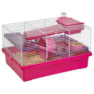 Plastová vícepatrová klec pro syrské křečky a křečíky s vybavením.
