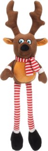 Vánoční hračka pro psy ve tvaru soba s pruhovanou šálou a dlouhým nohama je vyrobena z hebkého plyše.