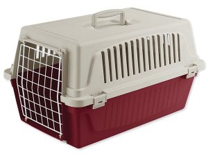 Plastová přepravka s kovovou mřížkou vhodná pro psy, kočky a jiná domácí zvířata.