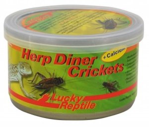 Konzervovaní cvrčci. Specialitou konzervovaných krmiv od Lucky Reptile je fakt, že do většiny je přidáván sépiový prášek jako zdroj vápníku.