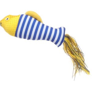 Hračka pro kočky ve tvaru ryby je vyrobená z měkkého materiálu s jemně texturovaným povrchem.