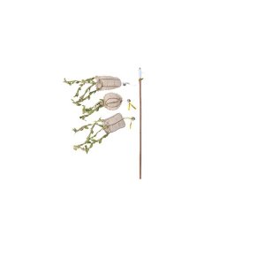 Vábnička s rukojetí ze dřeva má závěs se šantovou (catnipovou) kuličkou, peříčky, rolničkami a dřívkem ovinutým jutovým provázkem.