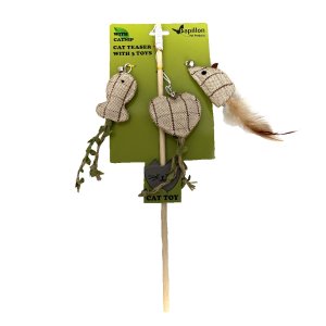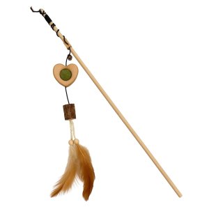 Vábnička s rukojetí z odolného dřeva sapeli má závěs s peříčky, srdíčkem z lisované šanty kočičí (catnipu) a provázkovými …