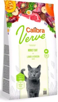 Calibra Cat Verve Adult Lamb & Venison 8+ je kompletní krmivo bez obilovin s vysokým obsahem čerstvého jehněčího masa a zvěřiny.