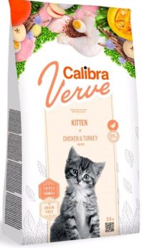 Calibra Cat Verve Kitten Chicken & Turkey je kompletní krmivo bez obilovin s vysokým obsahem čerstvého masa – s kuřetem a krůtou.