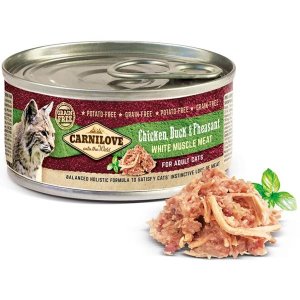 Konzerva pro kočky s bílým kuřecím masem ze svaloviny a chutným kachním a bažantím masem. krmivo je určeno pro dospělé kočky obsahuje 55 % skutečného …