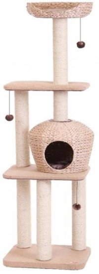 Kočičí strom z koberce s jehličkovým vlasem a sisalovou rohoží navržený tak, aby kočky mohly uspokojit svůj přirozený instinkt škrábat.Podstavec kočičího stromu vyrobený ze dřeva s certifikátem FSC®.Jedna, dvě nebo tři útulné skrýše vystlané měkkým kožíškem, které zajistí kočce pohodlí při odpočinku a relaxaci.Vhodné pro všechny typy koček. velikost 110 (výška 110 cm, průměr 42 cm) Rozměry: 410 x 410 x 1100 mm