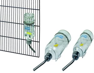Napáječka ze skla, která se ke kleci uchytí z vnější strany a dovnitř klece se jen prostrčí kovová trubička.