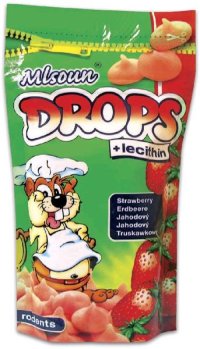 Jahodové bonbony pro hlodavce, doplňkové krmivo.Krmný návod: podávejte 1-3 ks denně.Složení: obiloviny, tuky a oleje, cukry, sušená syrovátka, sušené mléko, jahodové aroma, lecitin.Jakostní znaky: proteiny 5,7%, vlhkost 4,8%, tuky 24%, hrubé popeloviny 3,4%, vláknina 1,1%.