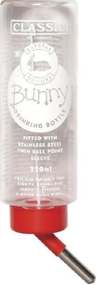 Napáječka z průhledného pevného plastu, která se ke kleci uchytí z vnější strany a dovnitř klece se jen prostrčí kovová trubička.