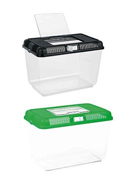 Přepravní a krmící box, pro přepravu, chov a krmení plazů a obojživelníků. ideální pro uchovávání živé potravy a jako dočasná karanténní zónasnadno se čistís otvorem pro krmení ve víkupřídavná boční krmící dvířka umožnují krmení, když jsou boxy na sobě materiál: plastrozměry: 38 x 26 x 24 cmbarva: různá