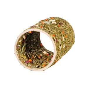 Bylinková přírodní pochoutka pro hlodavce ve tvaru tunelu na roli se smilkou.