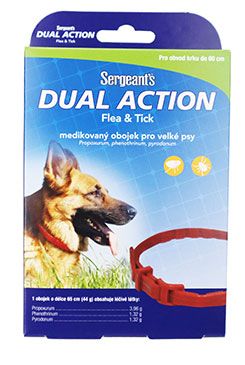 Ektoparazitní obojek pro velké psy• obojek proti blechám a klíšťatům• voděodolný• příjemně voní• bezpečný, mohou je používat štěňata od 3 měsíců i feny v období březosti i kojení• určen k trvalému nošení • pokud se obojek zamastí, stačí ho omýt mýdlovou vodou• účinkuje 6 měsícůÚčinné látky: Propoxurum 3,96 g, phenothrinum 1,32 g, pyrodonum 1,32 gHmotnost: 44 gDélka: 65 cmBarva: cihlově červená