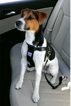 Bezpečnostní postroj pro psy, včetně autopásu s karabinou.