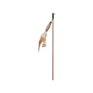 Vábnička s rukojetí ze dřeva má závěs se šantovou (catnipovou) kuličkou, peříčky, rolničkami a dřívkem ovinutým jutovým provázkem.