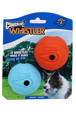 Chuckit The Whistler vydává (skrze otvory v míčku) při hře pískavý zvuk, který aktivuje zvědavost každého psa.