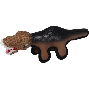 Hračka pro psy ve tvaru dinosaura kombinuje latex s ozdobným lemováním, plyš a manšestr.