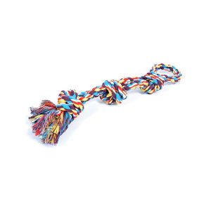 Odolné bavlněné přetahovadlo pro psy je spletené z pevných barevných provázků a má uzly pro lepší úchop při hře.