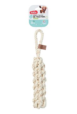 Provazová hračka pro psy vhodná na házení, žvýkání a přetahování.Vyrobená z bavlněného provazu a propletená kravskou kůží.Díky dvojité struktuře jseu velmi pevná, tudíž odolná při žvýkání. Přirozená vůně kůže psa přitahuje a stimuluje jeho přirozené instinkty.Štítek s logem z eko kůžeŽvýkáním se snižuje množství zubního plaku.Při hraní se posiluje pouto se zvířetem.Čtyři modely: míč, uzel, přetahovadlo a rukojeť.Čtyři velikosti: 22 cm, 29 cm, 39 cm a 50 cm.