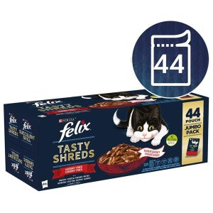 Multipack Felix Tasty Shreds je balení kapsiček obsahující trhané kousky s hovězím, kuřetem, kachnou a krůtou v lahodné šťávě.