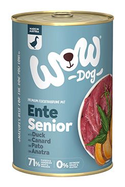 WOW Kachna s batáty je vysoce chutné a lehce stravitelné kompletní mokré krmivo vhodné pro citlivé a starší psy všech plemen se 71% obsahem masa a vnitřností od předního rakouského výrobce.